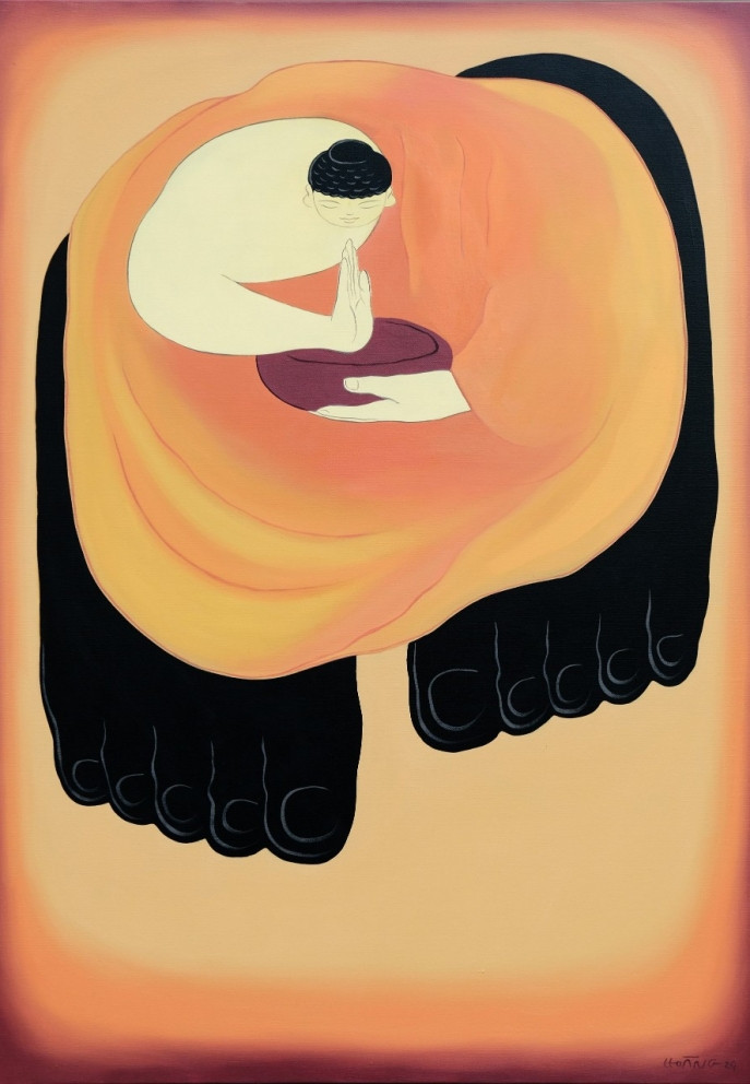 Artist Nguyen Xuan Hoang showcases a series titled "Buddhas," where he depicts Buddhas from an unusual top-down perspective, creating unique shapes. His works use bright, eye-catching colors and soft lines.