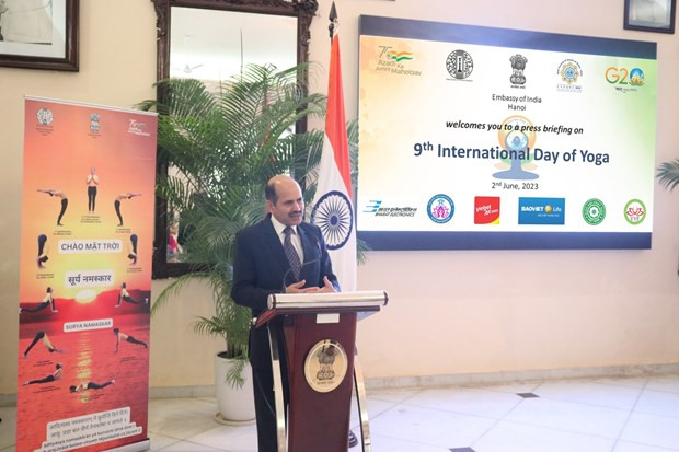 | Sandeep Arya, Indian Ambassador to Việt Nam, speaks at the press briefing announcing the International Yoga Day for this year. — VNA/VNS Photo |