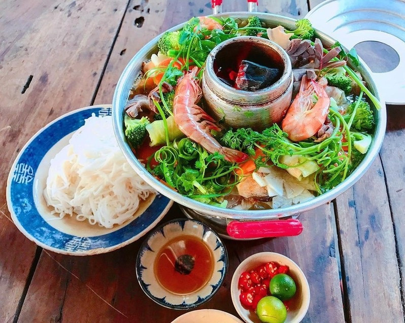 Different from hotpots in the north, the dish here includes more ingredients. They include pig’s heart, liver and marrow, grilled ‘that lat’ fish (a kind of fragrant and sweet fish from the region), duck egg, a piece of dried pork skin, dried squid, dried shrimp, pork paste, cabbage, carrot, cassava, white radish, coriander, salt, sugar, pepper, broth, quality Phu Quoc fish sauce and chili.
