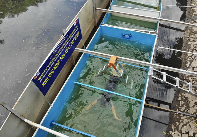 Dr. Kubo Jun, a technical advisor from the Japan Environmental Trade Organisation, jumped into the tank set up in To Lich River in Hanoi on Thursday.