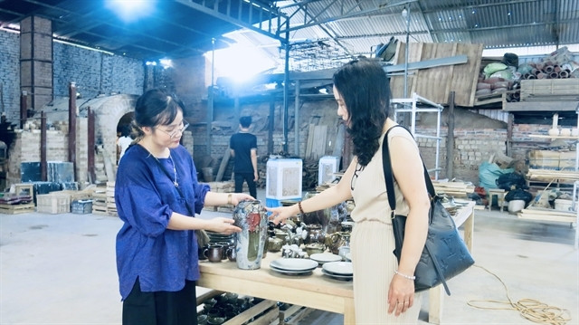 | Hoàng Thị Thủy (left) presents her product to a visitor in the project's shared production kiln in Phù Lãng Village.—VNS Photo Nguyễn Hằng |
