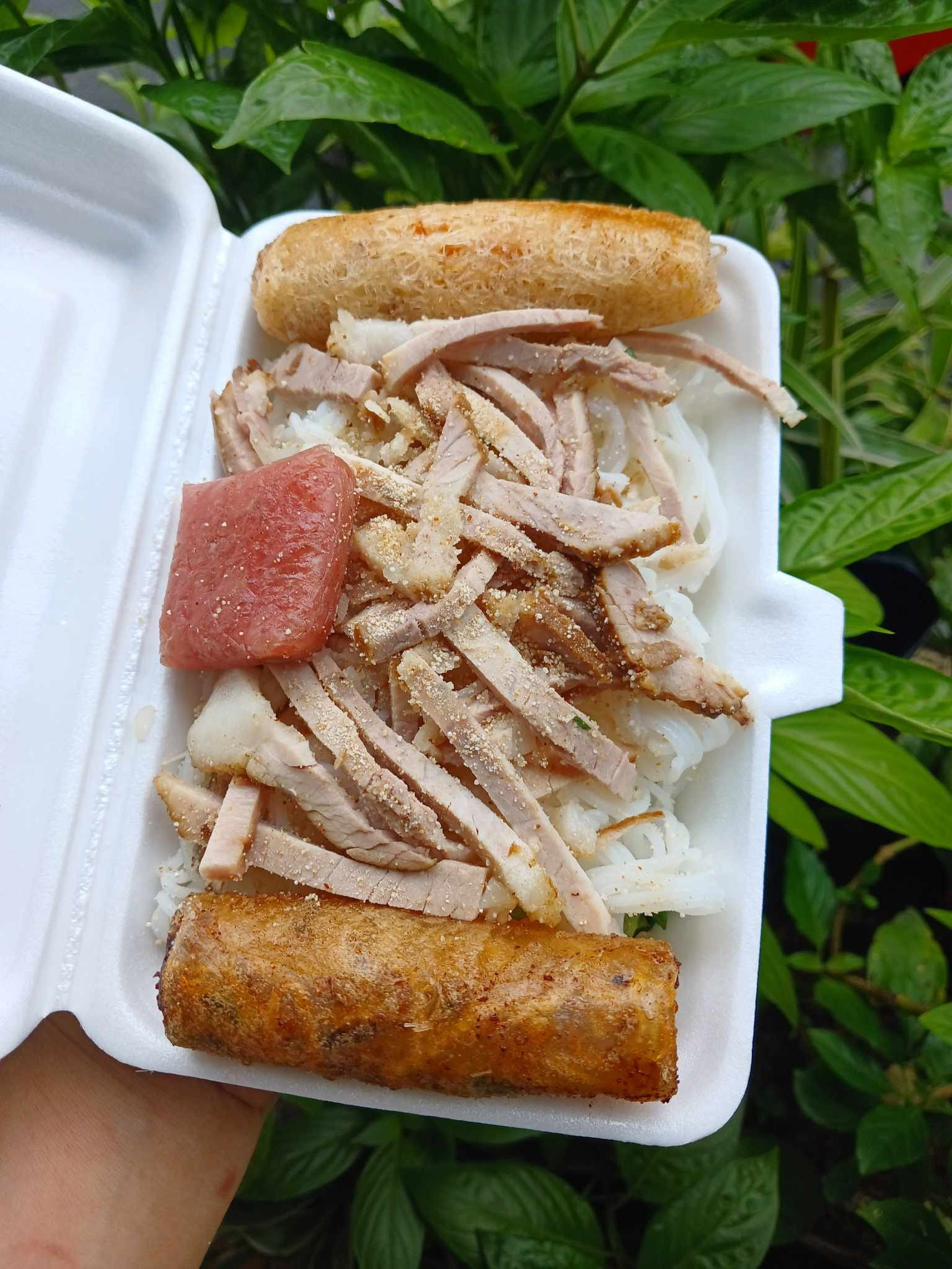 The dish is served with shredded pork skin, thinly sliced boiled pork, fermented pork sausage, and two types of spring rolls: one wrapped in rice paper and another in crispy lattice rice paper. It’s also accompanied by fresh vegetables, pickled cucumbers, and herbs, all tossed with a tangy sweet-and-sour fish sauce and toasted rice powder.