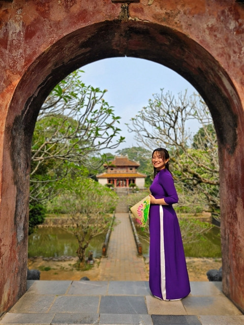 | Sai Koshikawa in typical purple Huế long dress fashion poses for a photo at a tourism site in Huế City. |