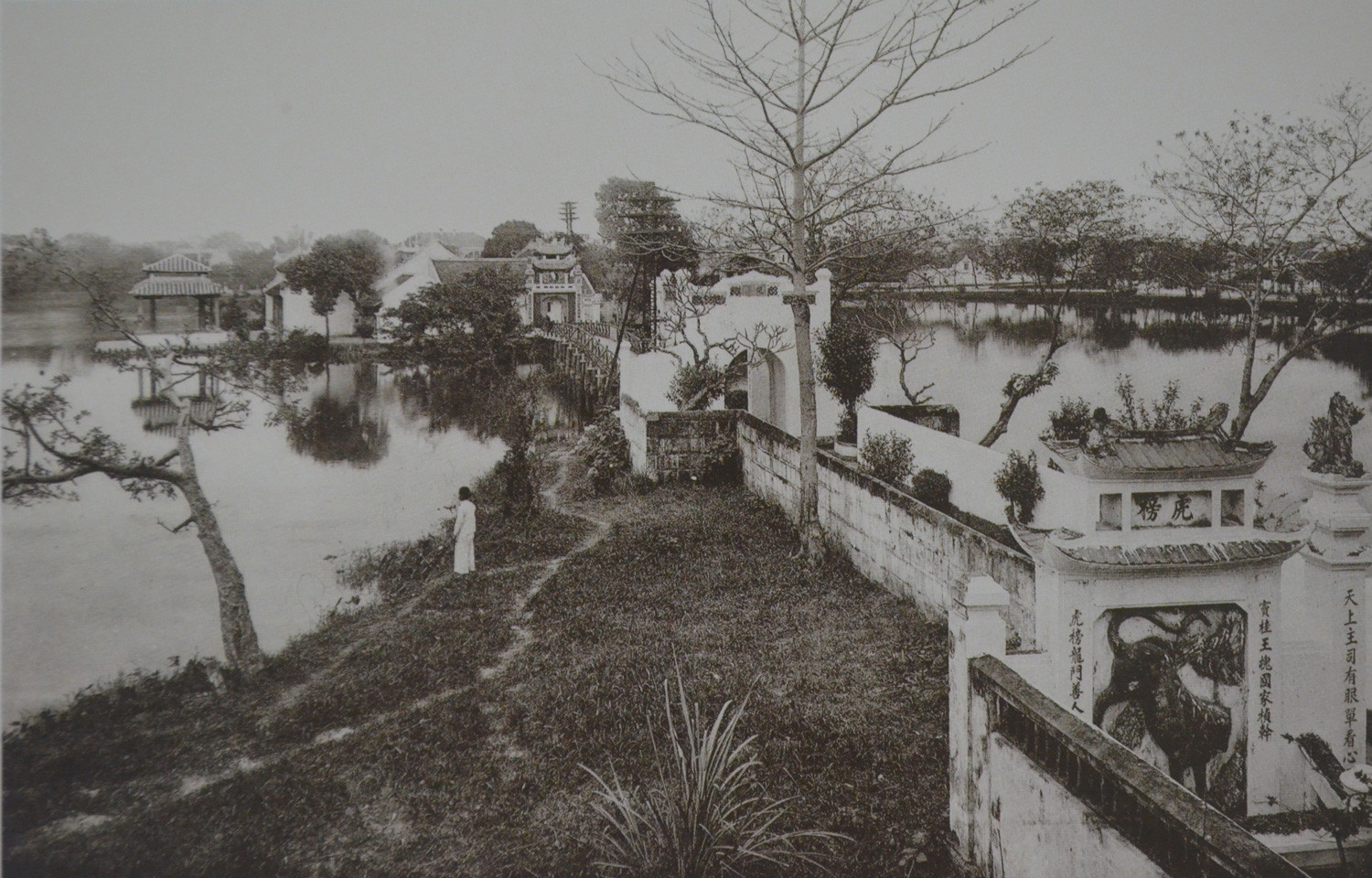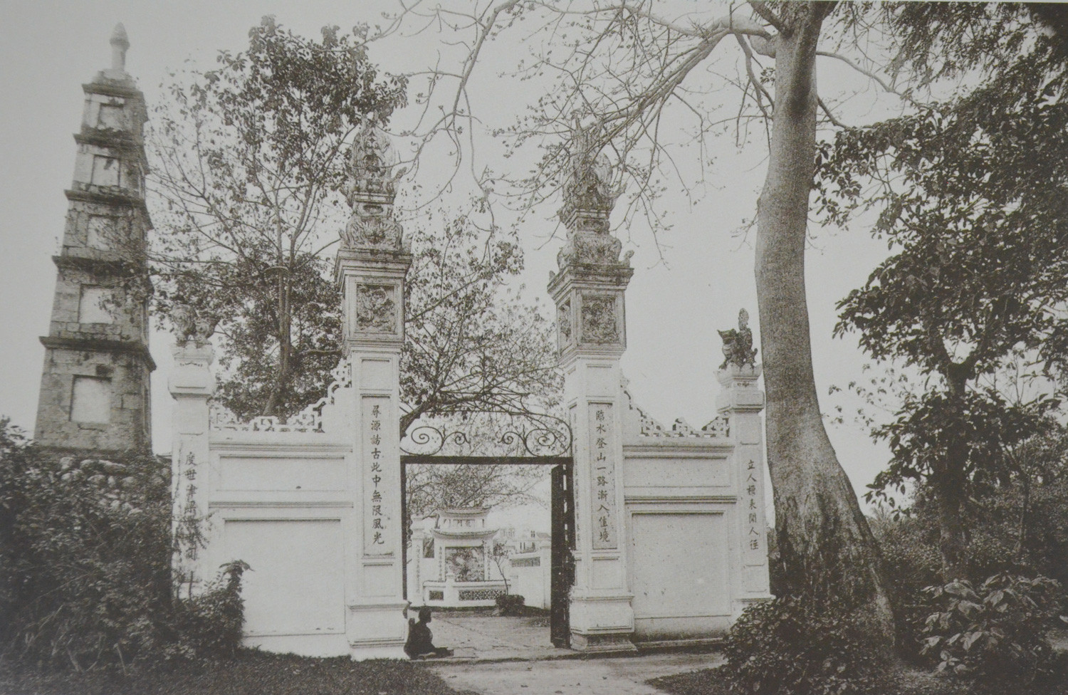 The images captured by Pierre Dieulefils show that long ago, people freely rowed boats on Hoan Kiem Lake.Ngoc Son Temple is located on Jade Island in Hoan Kiem Lake. It is a cultural and religious relic dedicated to Saint Tran Hung Dao and Quan Vu De, along with two other deified military leaders. The temple has witnessed the naval drills of the Dai Viet army. The temple is accessed via a system of gates and the The Huc Bridge, which connects Jade Island to the eastern shore of Hoan Kiem Lake. Historically, Jade Island was where Lord Trinh Giang built the Khanh Thuy Palace during the Vinh Huu era (1735-1739) for summer enjoyment. To beautify the scenery, the lord had two mounds, Dao Tai and Ngoc Boi, constructed on the eastern shore.When the Trinh family fell, Le Chieu Thong, who was restored to power by Nguyen Hue in 1786, took revenge by burning down the Lord's Palace and Khanh Thuy Palace. In the early 19th century, a pagoda was built on the former palace site on Jade Island, named Ngoc Son Temple, with a high bell tower. In 1843, the Huong Thien Society converted the pagoda into a temple dedicated to the Three Saints and Saint Tran Hung Dao. The bell tower was later demolished. In 1864, patriotic scholar Nguyen Van Sieu renovated the temple, emphasizing the worship of Wen Chang, the deity overseeing examinations in Taoism. He also constructed stone embankments at the island's base and built the Tran Ba Pavilion in front of the temple, facing Turtle Island. The current architecture of Ngoc Son Temple retains much of its appearance from Nguyen Van Sieu's renovations.An image from Hang Bac Street. Historically, Hang Bac Street had three trades: minting silver ingots, goldsmithing, and money exchange. These trades originated from three renowned gold and silver craft villages: Chau Khe (Hung Yen), Dong Xam (Thai Binh), and Dinh Cong (Hanoi).An image of Paul Bert Street, one of the most luxurious streets in colonial Hanoi, commonly known as the French Quarter. Today, this street is called Trang Tien Street.Images of Hanoi Railway Station, the Opera House, the Supreme Court, the Exhibition House, and St. Joseph's Cathedral. The Exhibition House, built in 1902, resembled a castle, measuring 110 meters long, 30 meters wide, and 27 meters high, situated on a 3,000-square-meter lot. Due to war damage, the building was demolished. In 1985, with Soviet assistance, Vietnam built a new structure, the Vietnam-Soviet Friendship Cultural Palace, on the site.The ceremonial gate of Ngoc Ha Village Hall in Hanoi. The hall, built in the late Le Trung Hung period, enshrines Saint Huyen Thien Hac De. It is located at 158 Ngoc Ha Street, Ngoc Ha Ward, Ba Dinh District, Hanoi.An image of Lang Pagoda's gate. Lang Pagoda, officially known as Chieu Thien Temple, is an ancient pagoda in old Thang Long. According to inscriptions, the pagoda was built during the reign of King Ly Anh Tong (1138-1175). It is located in Yen Lang Village (Ha Hamlet, Vinh Thuan District), later Lang Village, an ancient village along the To Lich River. Today, the pagoda is situated on Chua Lang Street (Lang Thuong Ward, Dong Da District).An image of the pier and Doumer Bridge over the Red River. The French built Long Bien Bridge during their first colonial exploitation (1897-1914) to create a railway from the port city of Hai Phong across the Red River to Lao Cai and Yunnan, China. The bridge, made entirely of steel except for the approach ramps, became the largest in Indochina. Initially named after Governor-General Paul Doumer, it is now called Long Bien Bridge. At first, the bridge was mainly for trains, with pedestrian paths on either side. From 1920, with the advent of automobiles in Vietnam, the side paths were expanded to accommodate more vehicles.