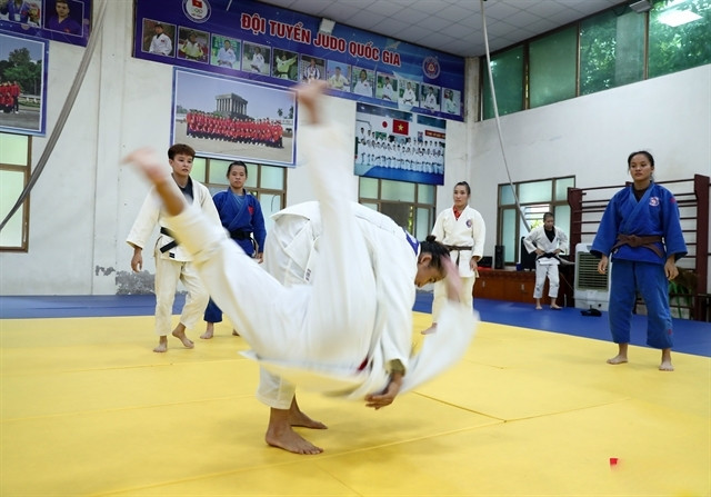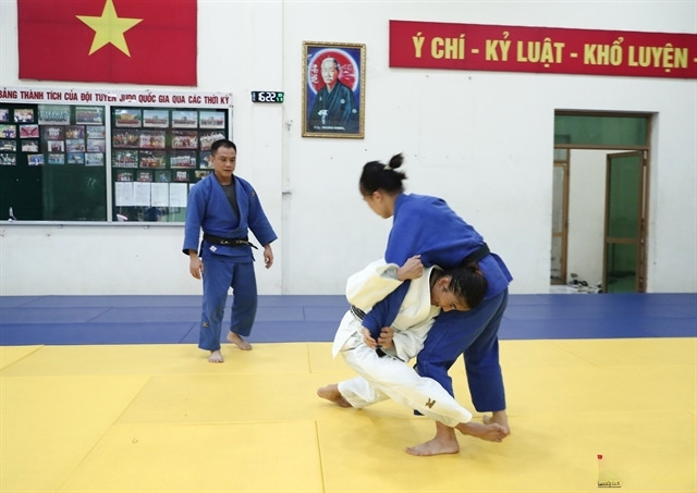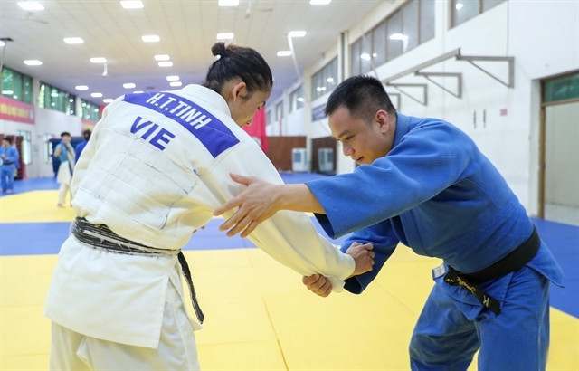 | Hoàng Thị Tình wrestles a teammate during their daily practice. Tình is the only Vietnamese judoka in Paris. -- Photo toquoc.vn |