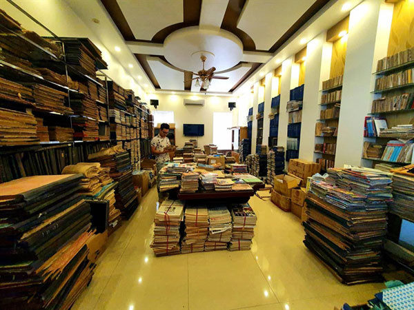 Dung carefully stores the volumes on the shelves or places them on tables according to the date of each issue.