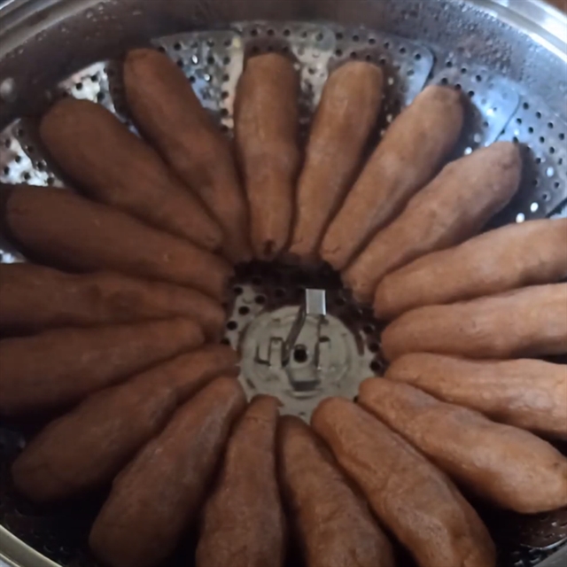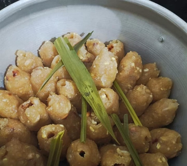 The condensed powder is kneaded and shaped into balls, each as big as a duck egg. Inside, a dumpling made of onion, peanut, or sesame is placed before steaming the cake.