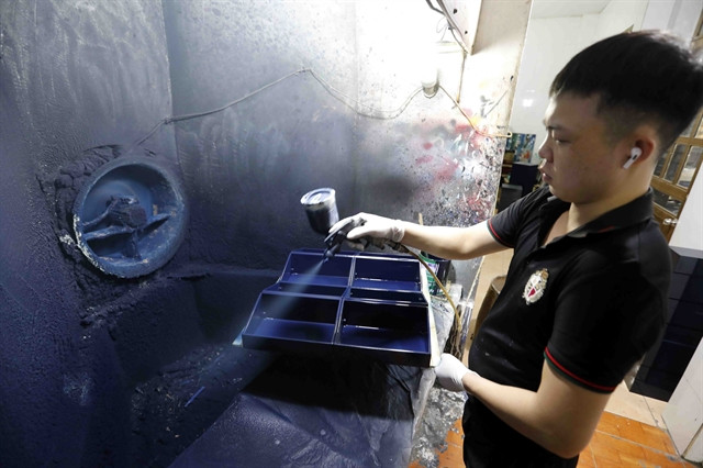 | A worker sprays paint on a product at the Thái Sơn Lacquer Company’s workshop in Hạ Thái Village. Spray painting is among dozens of steps of lacquer craft process. — VNA/VNS Photo Trần Việt |
