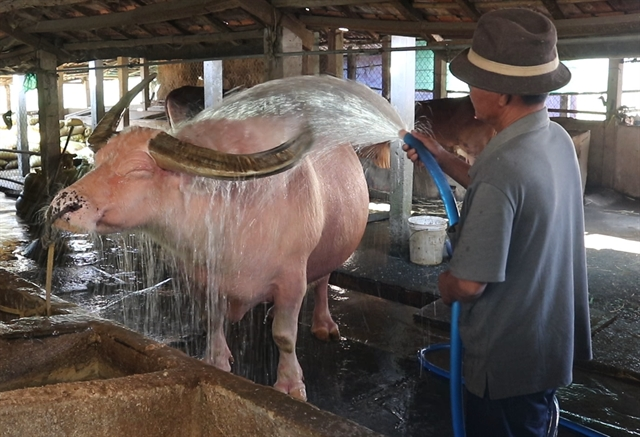 The bull is fed with mash mixed with byproduct fibersand grass. It can drink around 100 litres of water per day.– VNS Photo Việt Dũng |