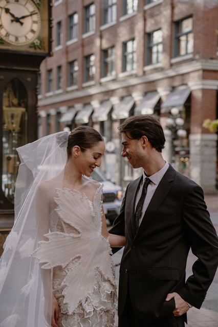 The second design is inspired by the snow-capped peaks of Canada. The dress has a deep cut at the back and is embellished with over 500 pearls and 1,000 crystals, weighing a total of two kilogrammes. The designer uses flexible mesh fabric to give the bodice a structured shape, paired with a tulle skirt. The dress can also transform into a shorter version for anniversaries or evening parties.