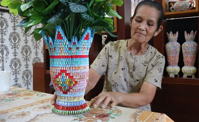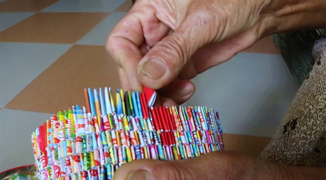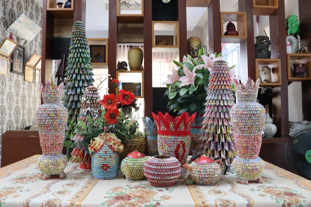 She told Việt Nam News that at first she only used calendar paper, but one day a friend offered to give her lottery tickets to work with.