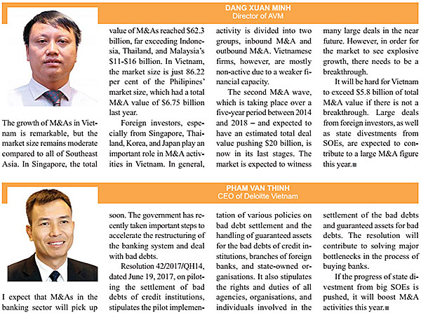 “Vietnam’s total M&A value in 2017 cannot surpass the $5.8 billion of 2016 if there are not big pushes from SOEs and government policies,” he added.