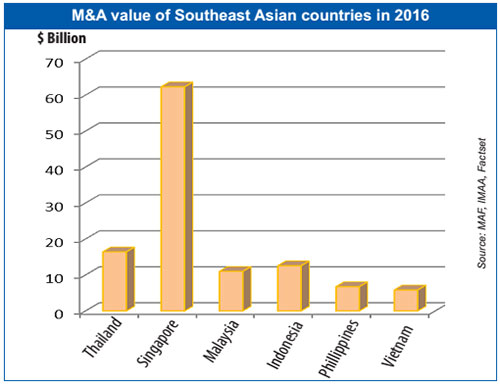 In 2016, the total value of M&As hit an all-time high of $5.8 billion, rising 11.92 per cent from 2015. Consumer goods, retail, and real estate were the most attractive to buyers. Among the sectors, M&A deals in retail accounted for 38.46 per cent of the total M&A value.