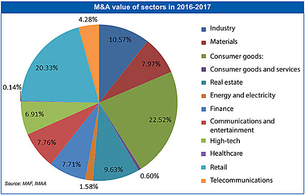 Between 2016 and the first half of 2017, retail made up 20.33 per cent of the total M&A value, followed by consumer goods with 22.52 per cent, and real estate at 9.63 per cent.