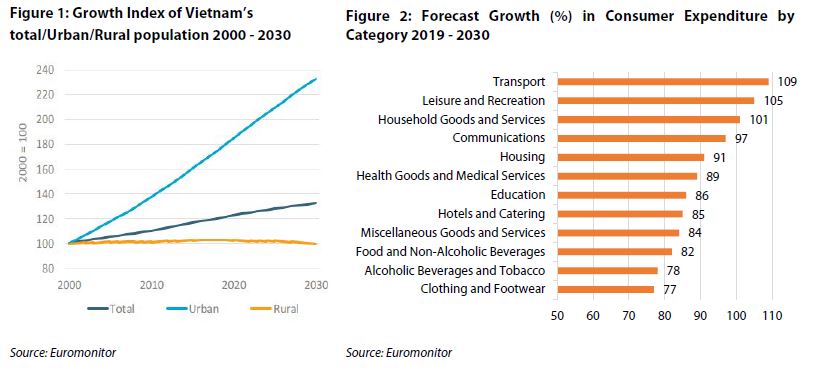 As Vietnam’s real GDP will likely grow by 91.4% during 2019 – 2030, consumer expenditure is predicted to boom. By 2030, 46 million urban consumers will spend some US$169 billion while that figure for 61 million of consumers in rural areas will be US$173 billion.
