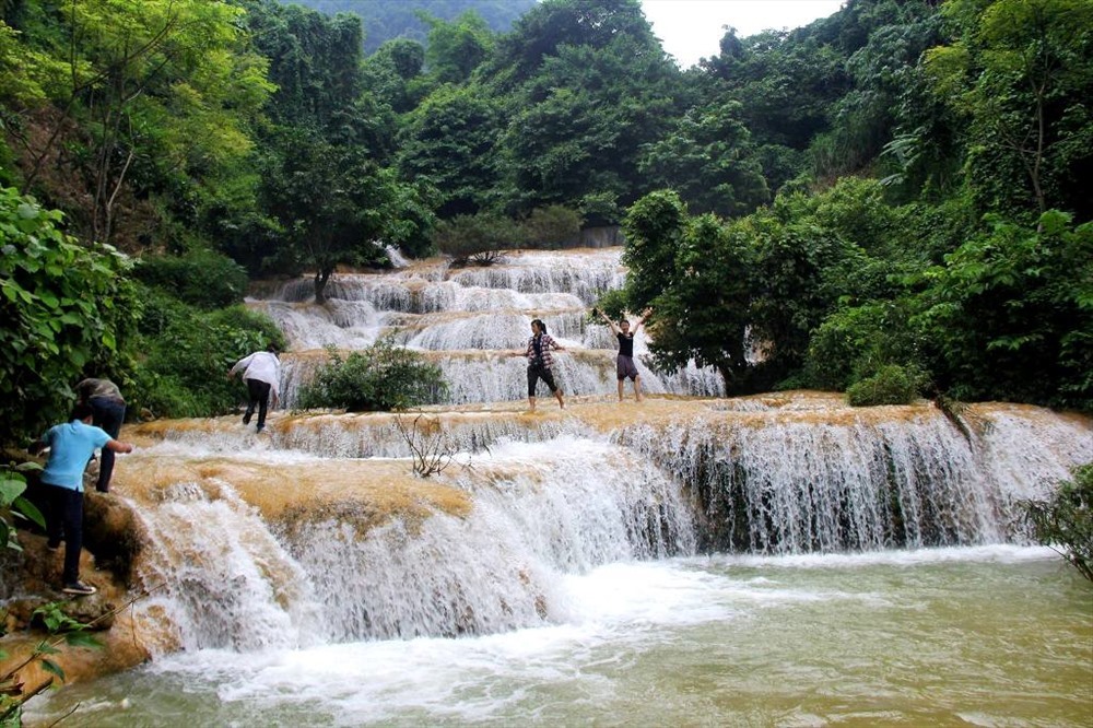 The nine-step waterfall gives visitors a chance to enjoy the wild natural scenery and cultural traditions of local residents who are from Muong ethnic minority group.