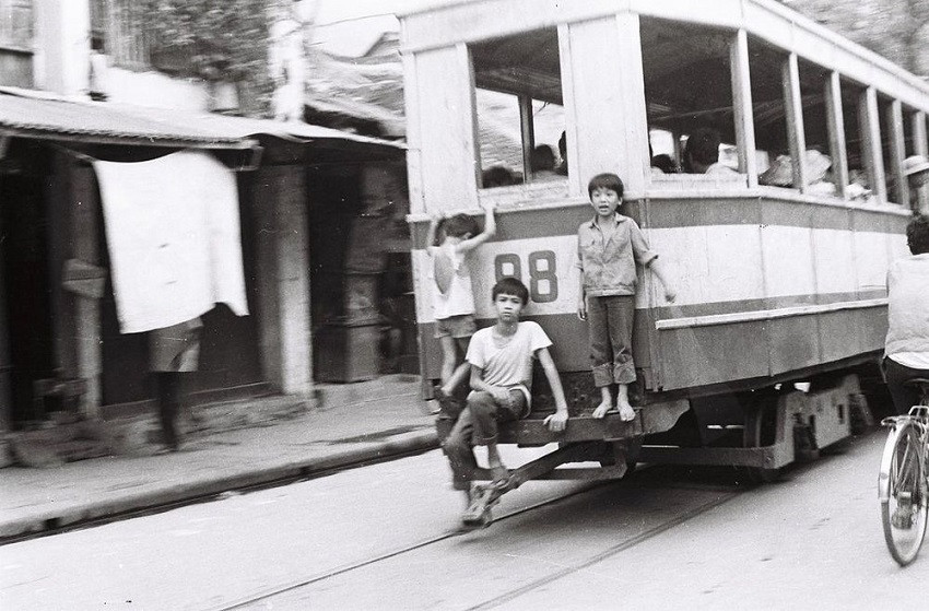 Photo of a tram crossing the street. This was an important means of transportation in Hanoi in the old days. In the early 1990s, the tram stopped working, but the sound of the train's jingle is still remembered by many Hanoians. |