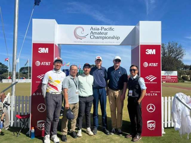 | TEAM Minh: Nguyễn Anh Minh (third, left) and teammates and coaches at the Asia Pacific Amateur Championship 2023 at the Australian Royal Melbourne. — VNS Photo Bạch Cường Khang |