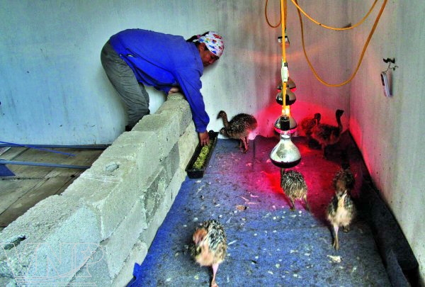 The newly-hatched ostriches are kept in specific cages which are equipped with a system of light bulbs for warmth. Each cage is watched over by three or four workers. Nguyen Thi Huyen, a technician at the farm said that the ostrich eats a lot, so the workers must watch over them while they eat and take care of them all the time.