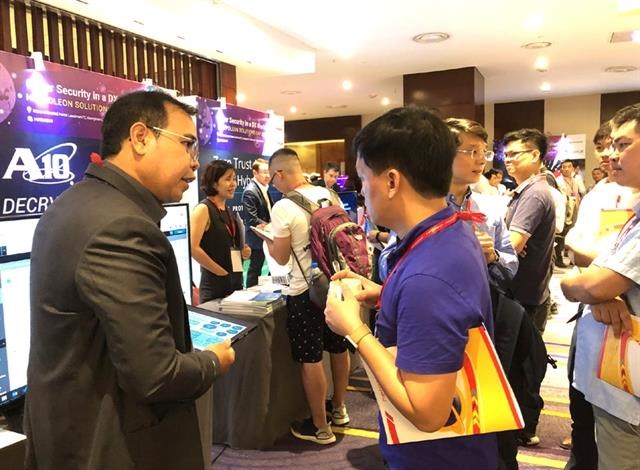 Attendants visit booths displaying computing and internet security solutions at a seminar on August 14. (Photo ictvietnam.vn) |