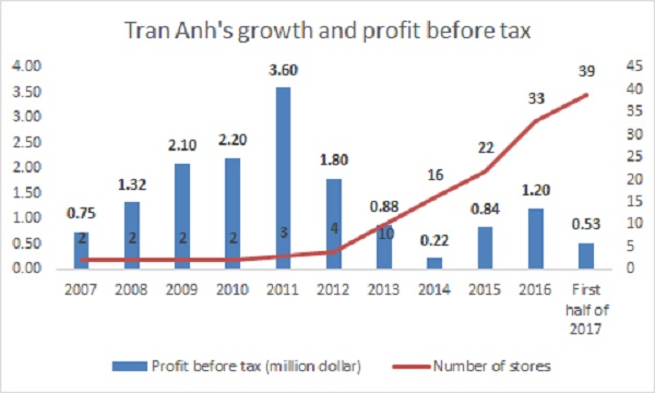 However, since the rapid expansion, Tran Anh’s profit has been plummeting as shown in the graph.