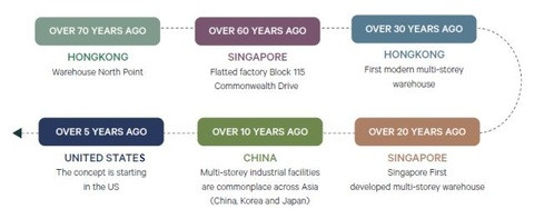 Multi-storey facilities have their roots in densely populated areas of Asia, in cities like Hong Kong, Singapore, Tokyo, Osaka or Shanghai, where demand is strong, but the land is constrained and expensive. It then appeared in Europe, the USA, and Australia due to its advantages.