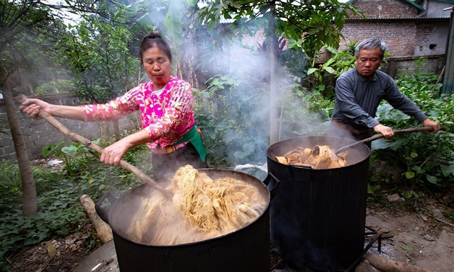 | The poonah paper-making process is laborious with over 30 working stages. The poonah tree bark will be soaked in water for two to three days to soften before it is boiled for 10 hours. — VNA/VNS Photo Trọng Đạt |