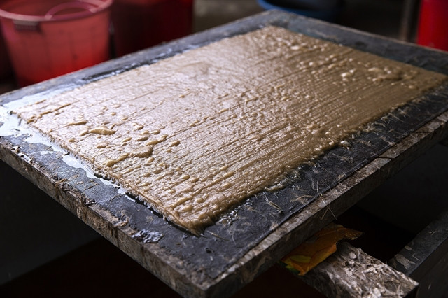 | To form a sheet of paper the pulp mixture is poured into a mould. — VNA/VNS Photo Trọng Đạt |