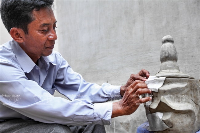 Today, some use cement to form the moulds which can be used several times. After the mould has dried, they use 5x7cm pieces of fabric which is coarse or the type often used to make mosquito nets, or slips of paper to add to the moulds using different kinds of glue, including the resin of the green fruit of Thon hop trees.