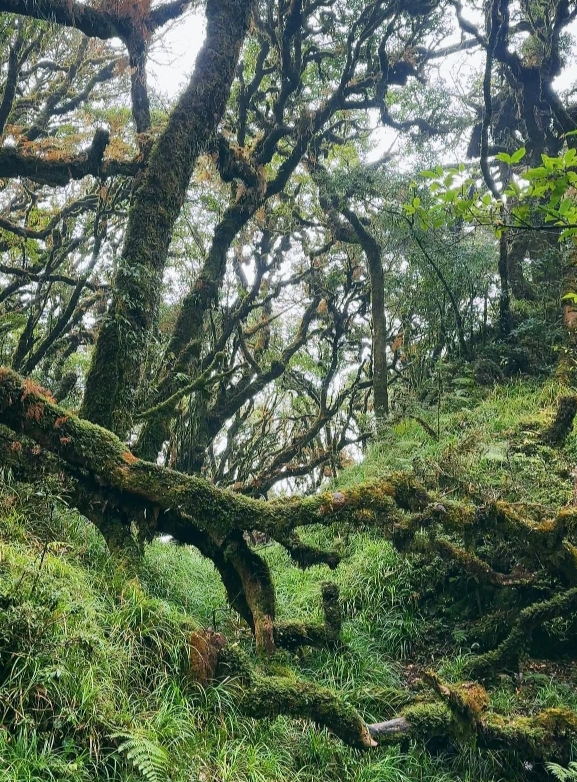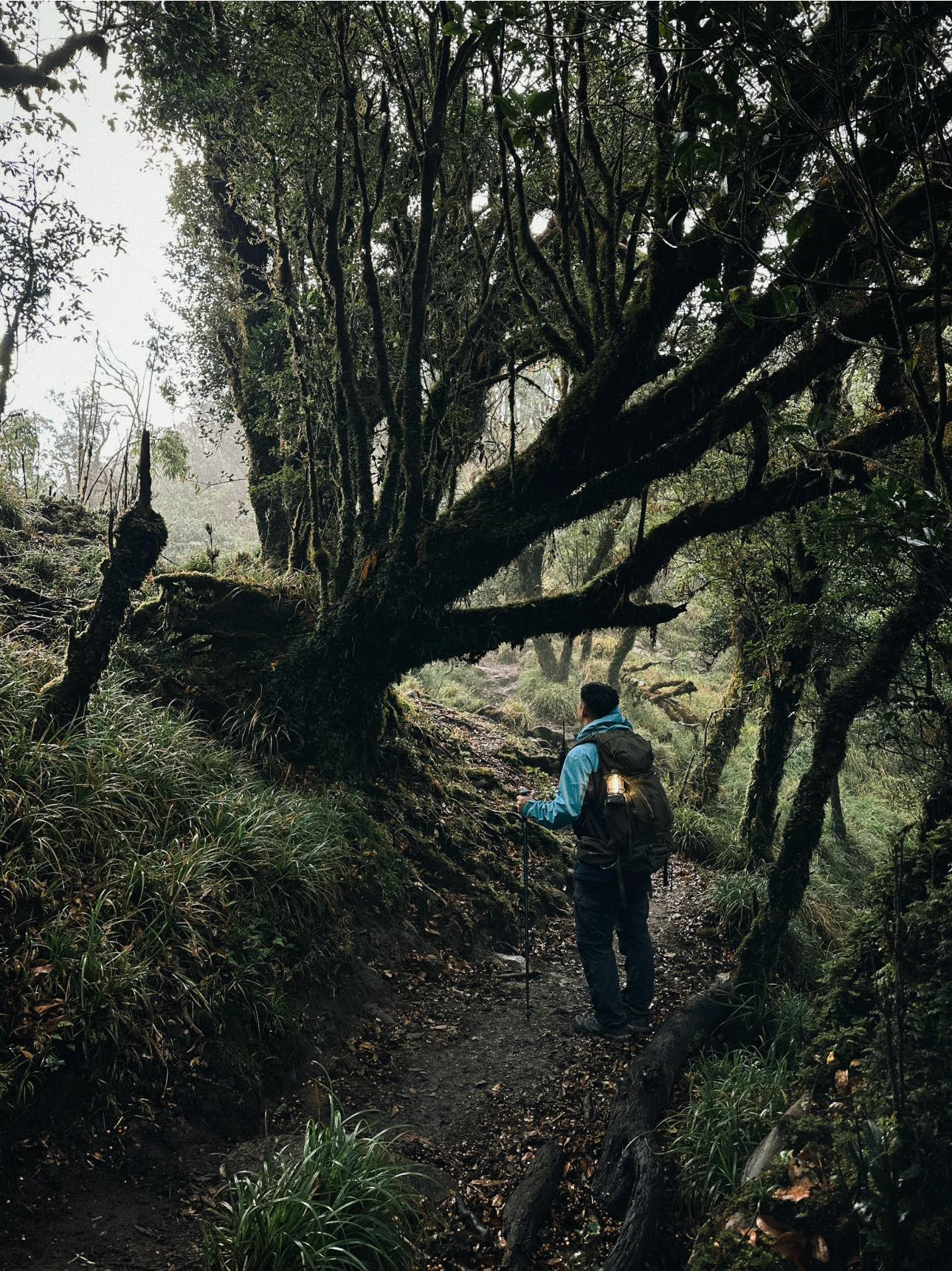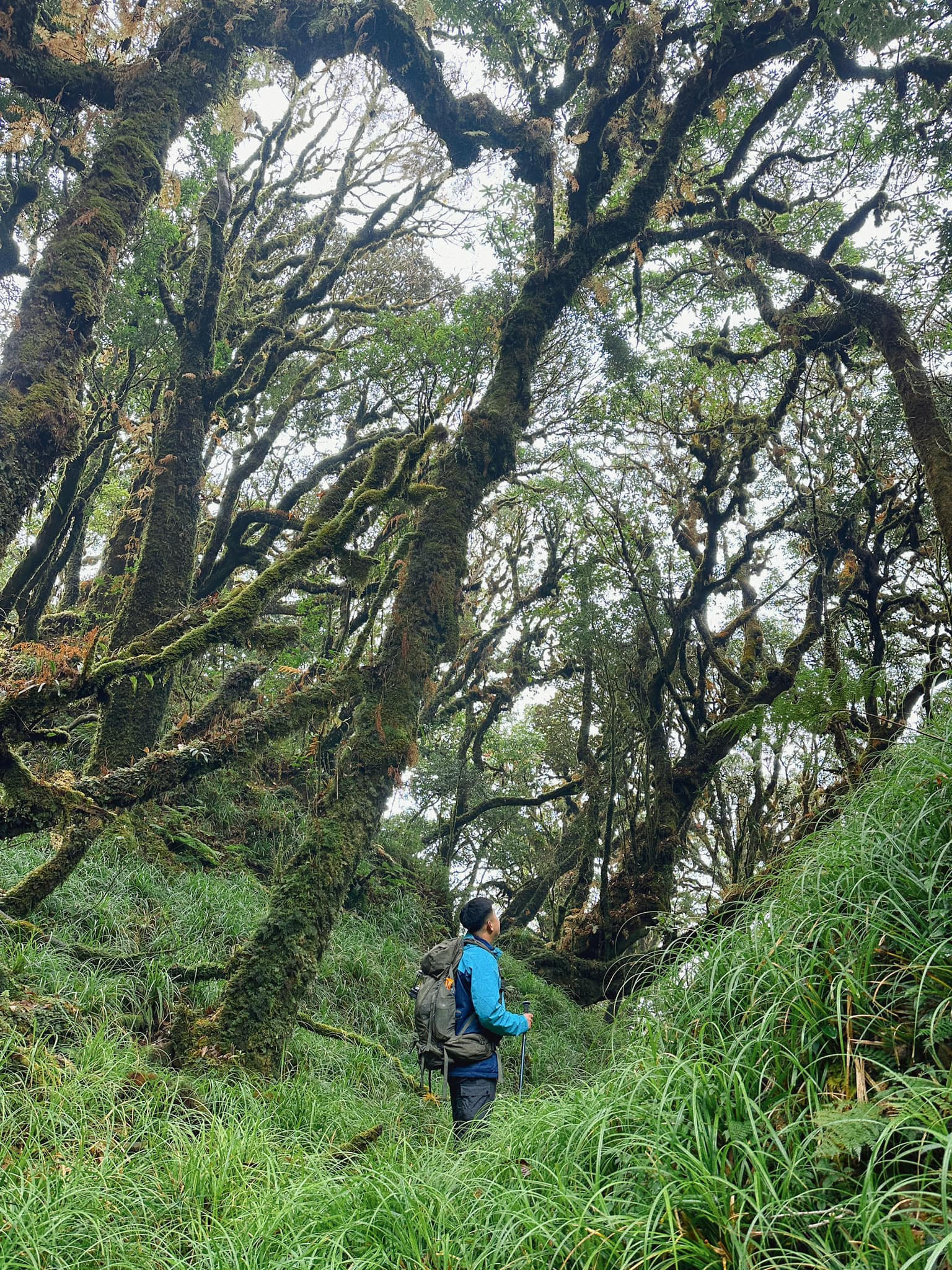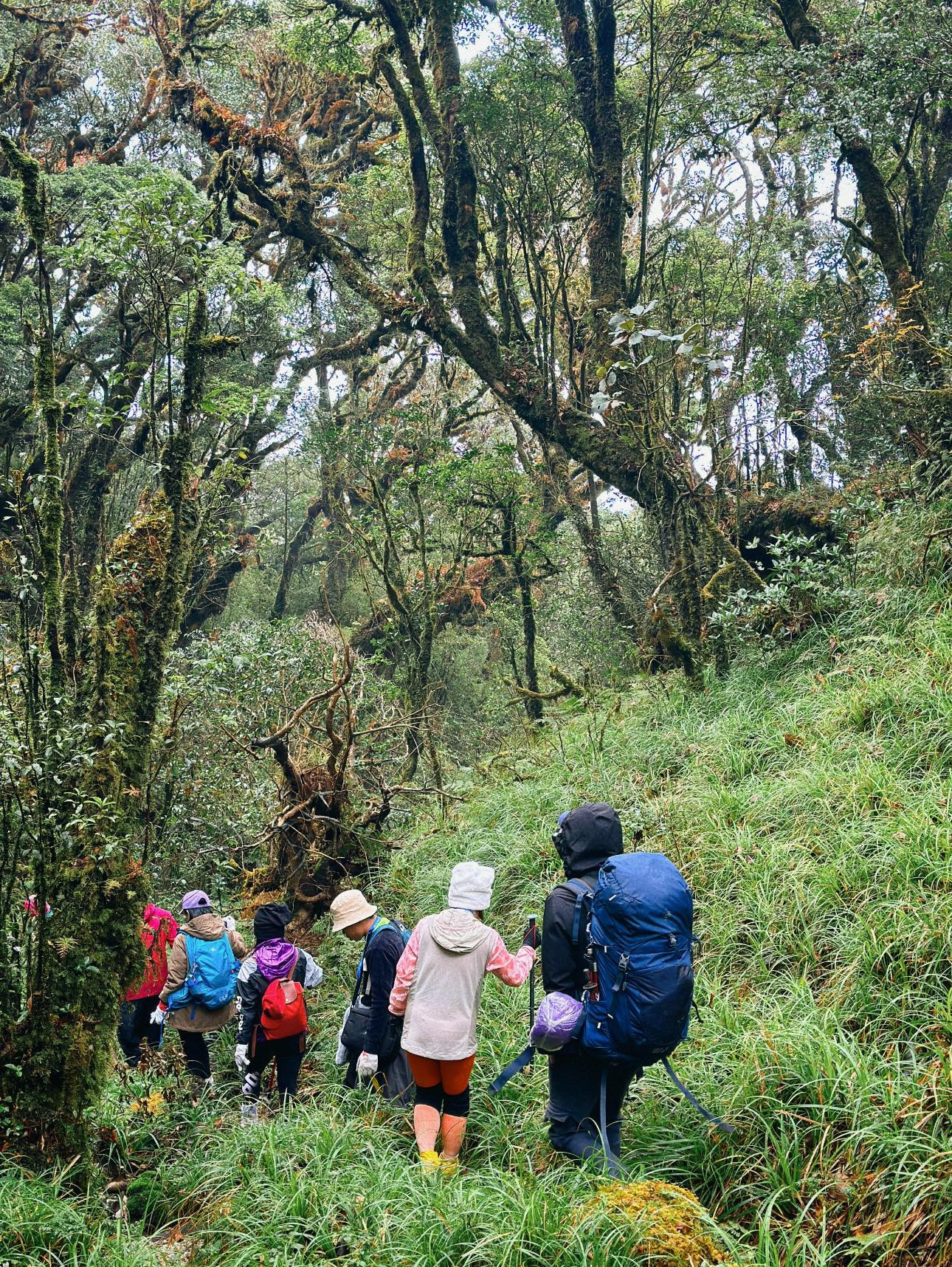 The trek passes through a pristine rainforest typical of tropical mountain ecosystems, featuring a rich tapestry of flora such as moss, rhododendrons, maple trees, and bamboo forests, interspersed with streams and waterfalls.
