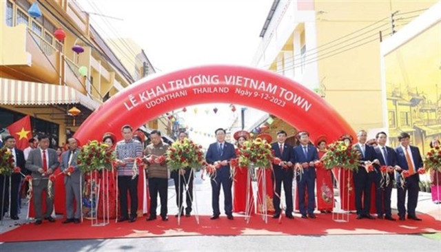 | National Assembly Chairman Vương Đình Huệ and other delegates cut the ribbon to launch the Vietnam Town in Udon Thani province, northeastern Thailand, on December 9 |