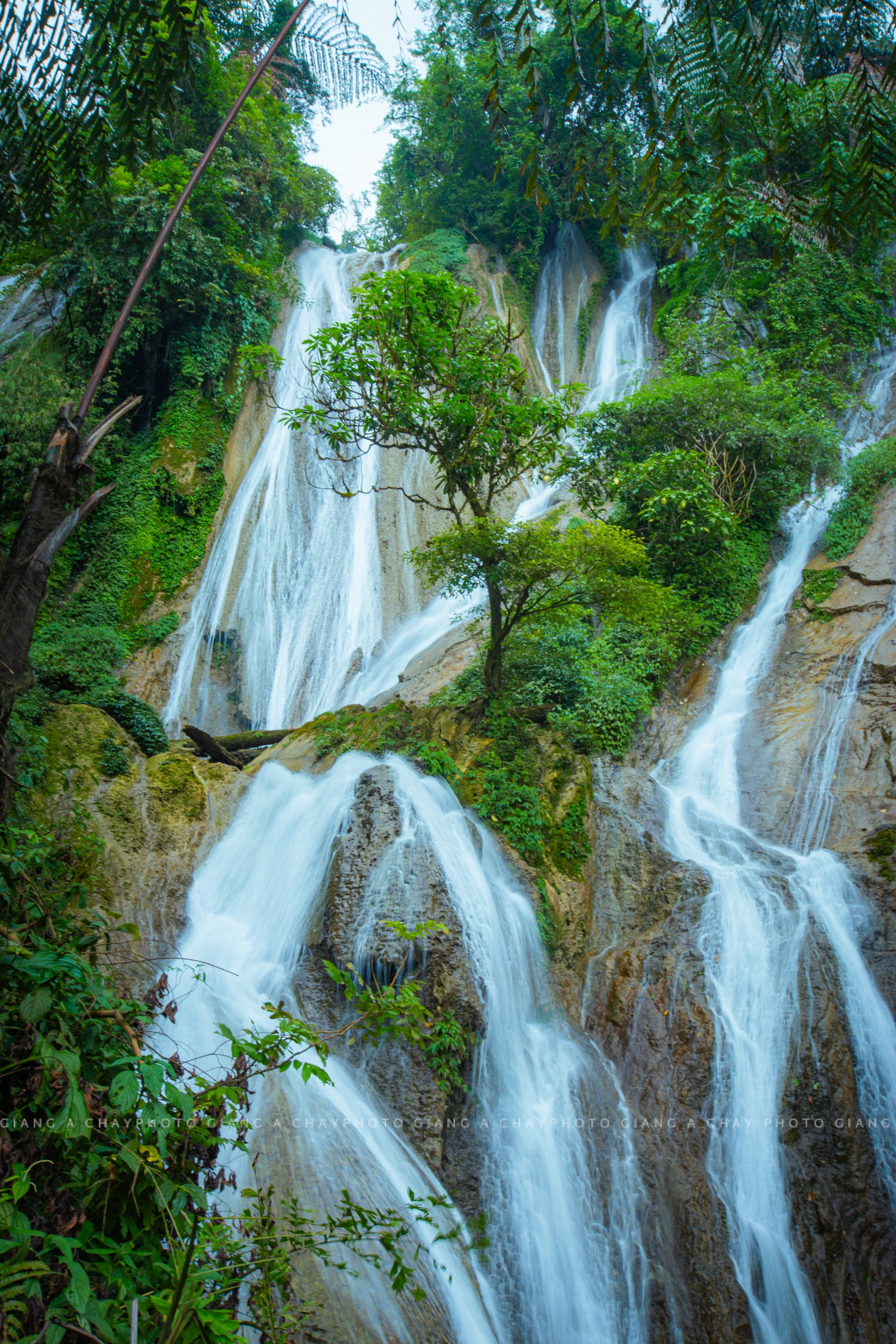 The water travels through multiple mountain ranges and, due to the steep slope, erosion, and localized geological faults, crashes down into the dramatic tiers of Nam Luc Waterfall.