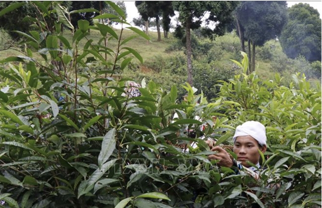 | An ethnic man harvests tea in Văn Chấn District of Yên Bái Province. VNA/VNS Photo |