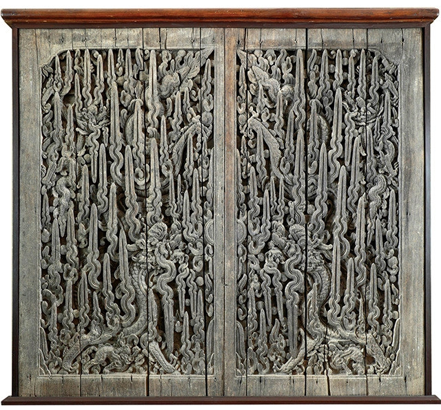 | Dragon-curved doors from Keo Pagoda in the northern province of Thái Bình is one of nine national treasures to be designed on silk. — Photos coutersy of DeSilk |
