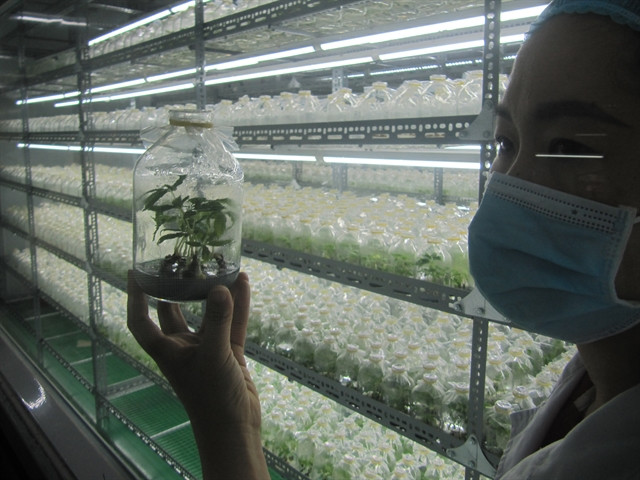 | BOTTLING IT: A female expert introduces a ginseng sampling produced in-vitro at Sâm Sâm company's R&D centre. About 5 million of saplings will be produced by the company in the near future. VNS Photo Công Thành |