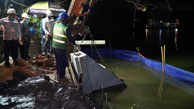 The 40-metre-long section at Thuy Ta Restaurant has been reinforced with the new embankment. Construction was started from 10 pm to 5 am on April 21. This is also one of the most serious erosion spots around the lake. After three weeks, they will reassess the effectiveness of the embankment and build it around the whole lake.