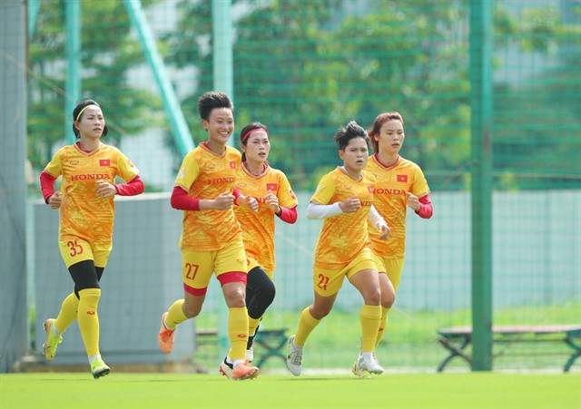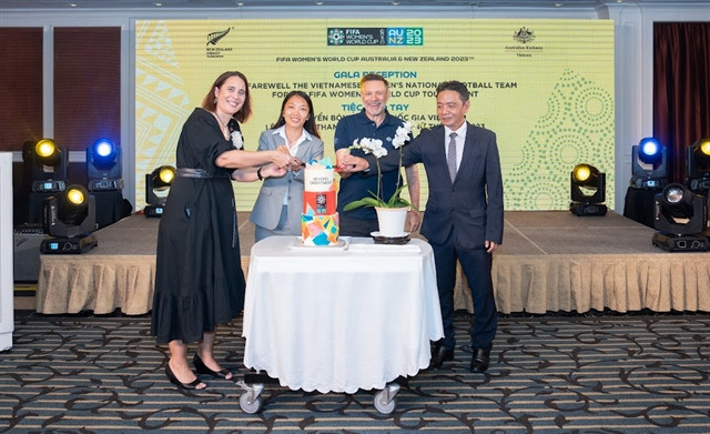 | (From left to right) New Zealand Ambassador Tredene Dobson, national team captain Huỳnh Như, Australian Ambassador Andrew Goledzinowski and Deputy Minister of Culture, Sports and Tourism Hoàng Đạo Cương cut a cake during the farewell party on July 2 in Hà Nội. Photo courtesy of the New Zealand Embassy. |
