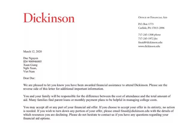 A letter from Dickinson College sent to Duc to inform the financial assistance of USD 210,400 for four years of study.