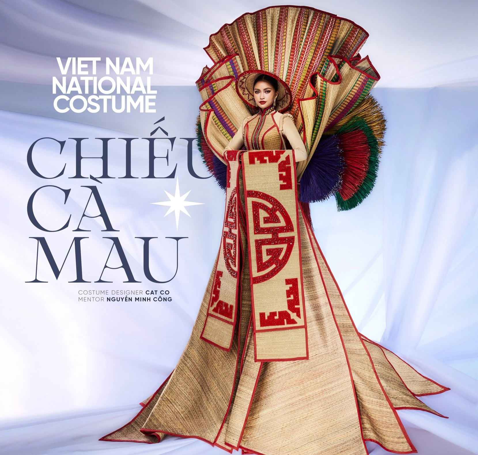 The costume is inspired by the beauty of the culture and people in the mat weaving village in the southernmost province of Ca Mau. It highlights the various cultural values and national identity of Vietnam.
