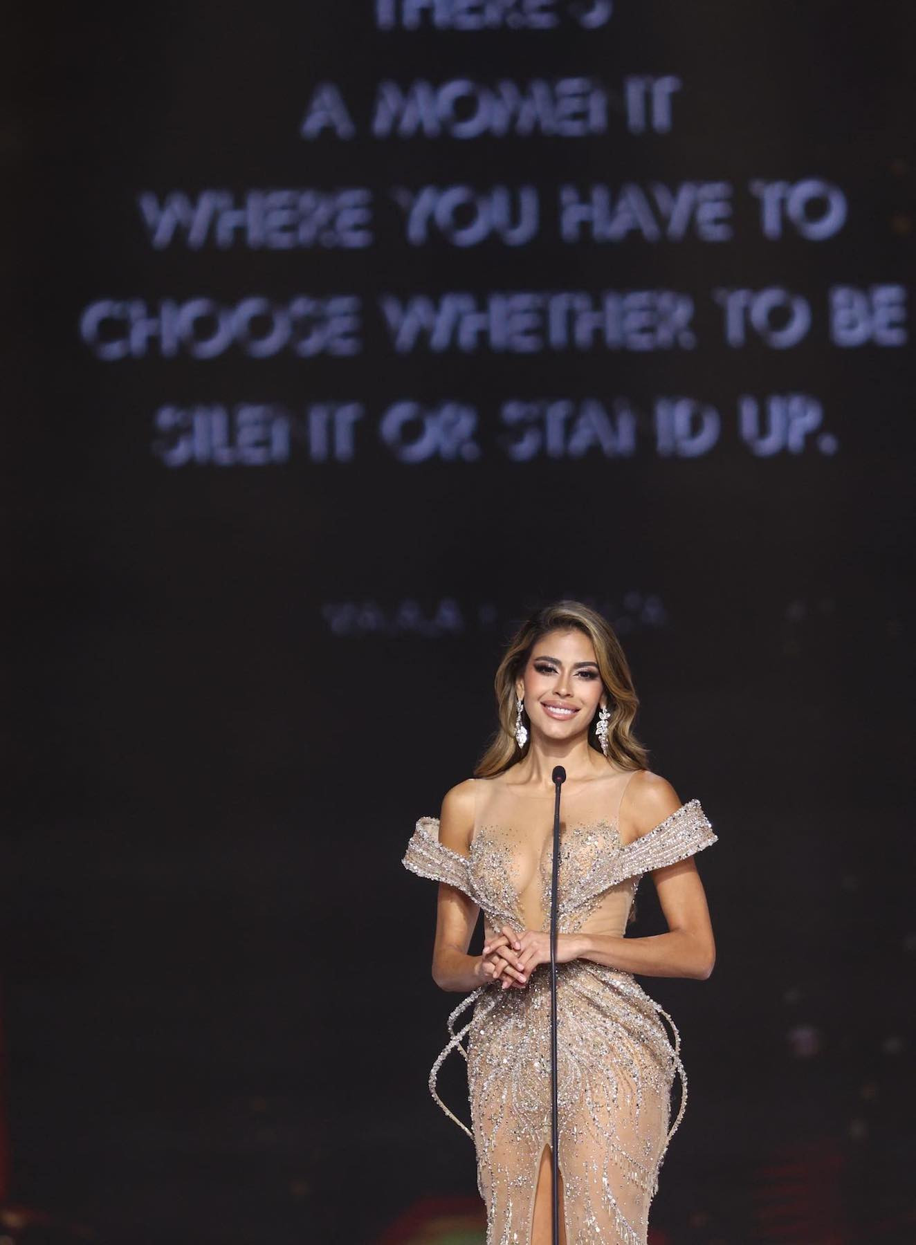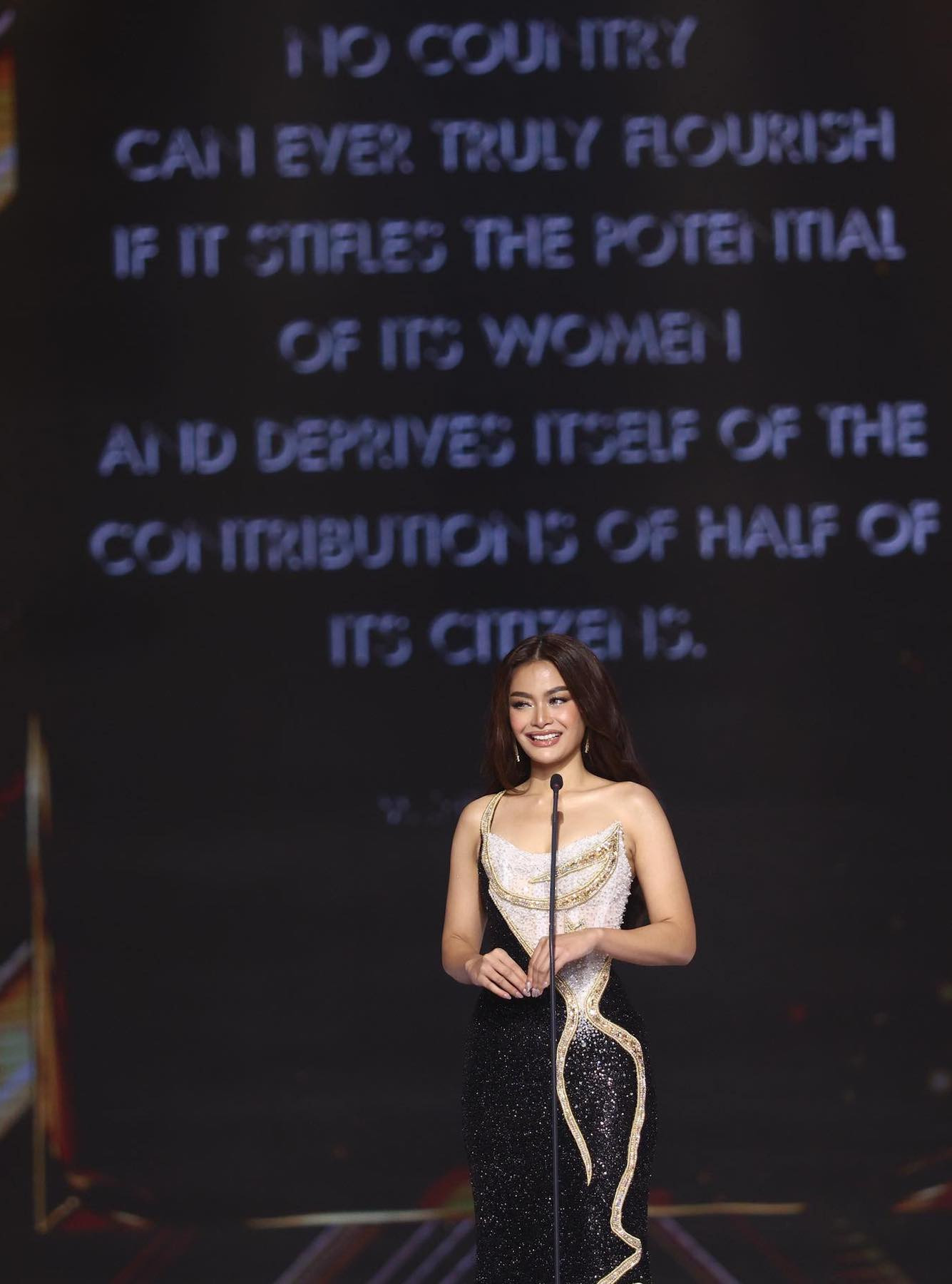 For the evening gown segment, Nhu Van wore a golden crystal dress by Vietnamese designer Do Long, inspired by Vietnam’s golden rice fields. She advanced to the Top 5 and then the Top 3, ultimately competing against contestants from Jamaica and Puerto Rico in the final round.