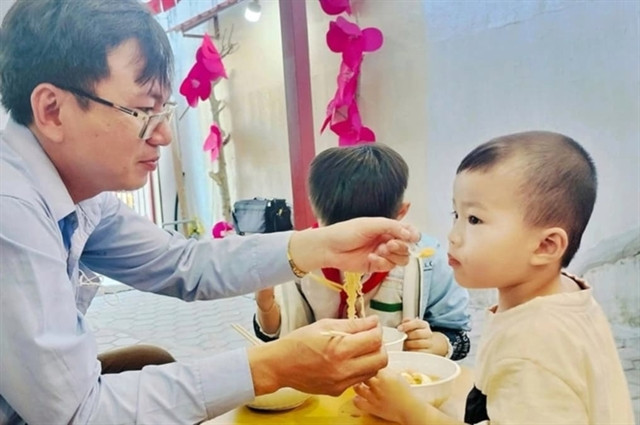 | Dư Vĩnh Tường brings his children to the noodle shop to share the experience and teach them about compassion. Photos vov.vn |
