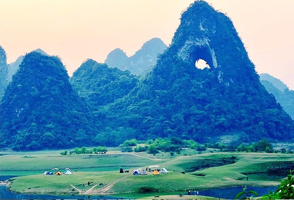 Nui Thung impresses visitors with its unique appearance as it has a hole, measuring 50m in diameter, passing through its face, which looks like a giant eye in the centre of the mountain.