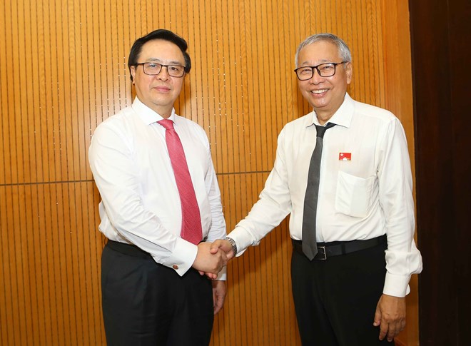 Head of the CPV Central Committee’s External Relations Commission Hoang Binh Quan (L) andU Thein Oo, member of the NLD Central Executive Committee, head of the financial committee and member of the economic committee of the NLD