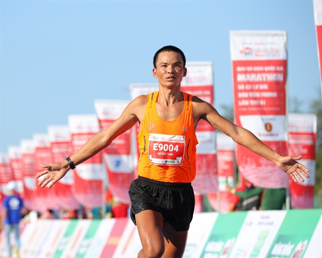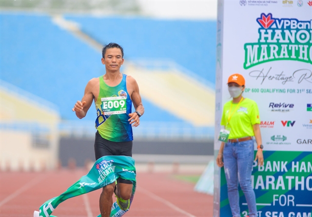 Lê Văn Tuấn crosses the finish line of the VPBank Hanoi Marathon on March 6. He secureda berth to represent Việt Nam at the 31st SEA Gamesmarathon. Photo ofVPBank Hanoi Marathon |