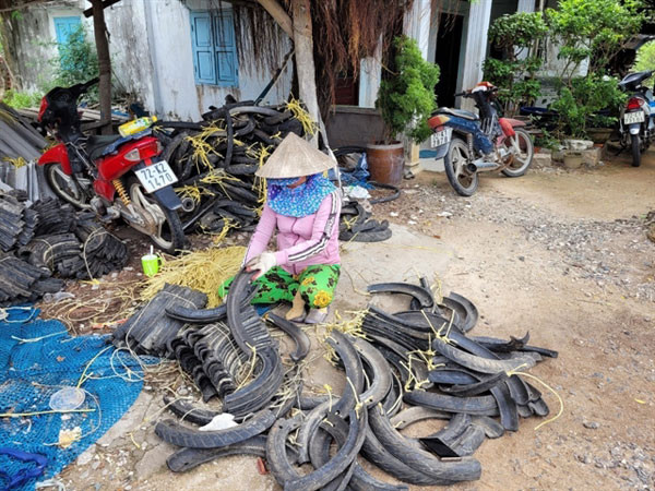 The sale of old rubber tires is common in Long Sơn Commune. Used tyres are collected and split in half with a length of about 60cm to 80cm. Each piece is perforated so that farmers can string two pieces together to hang on the raft.