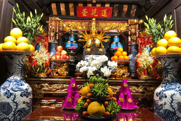 There is an altar lacquered in gold and crimson with cloud motifs, on top of which sits a gilded statue of the thousand-eyed and thousand-armed Goddess of Mercy. Surrounding the statue are many worshiping objects: a pair of ceramic feng shui wealth vases, lotus vases, a set of teapot and cups, and a bronze incense burner. Above the statue hangs a small crimson horizontal inscribed board with three golden words ‘Lien Hoa Dai’.