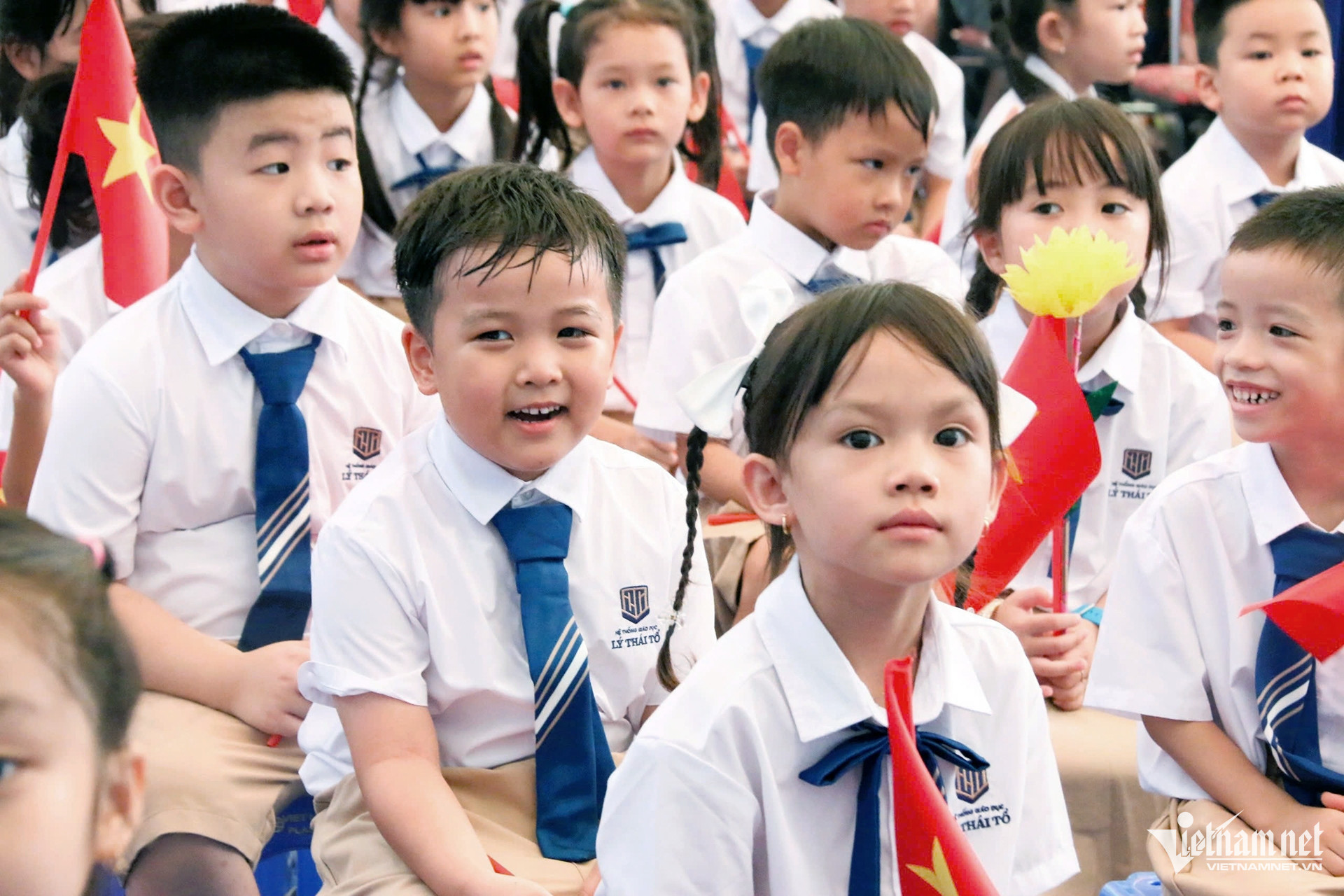 The opening ceremony at Linh Dam Primary School (Hoang Mai District, Hanoi). Principal Ta Thi Thanh Tam noted that while the school's facilities are modern and clean, they still lack enough classrooms, so students have to rotate classes.