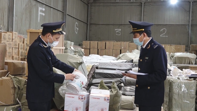 | Customs officers in Lạng Sơn Province inspect the origin of goods at a warehouse in Hữu Nghị border gate. — VNA/VNS Photo |