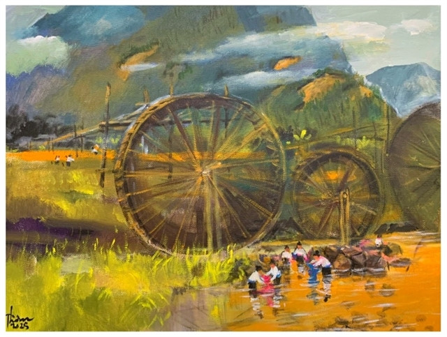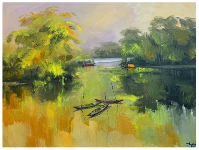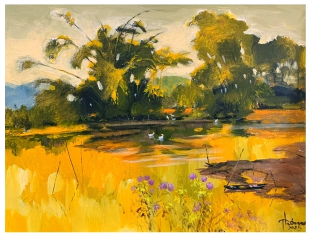 “Each of my paintings is a fragment of memory, a breath of childhood, and a moment of slow, deep living. I was born among bamboo hedges, rice paddies and ponds. Those colours of nature are very real and very close. And even if I go far away, that village essence always lingers, like an unending nostalgia,” the 54-year-old painter said.