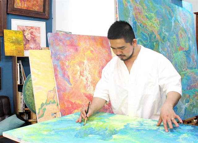 | Artist Nguyễn Thanh Vũ draws the works of the “Từ Tính Tứ Linh” exhibition. The exhibition will be opened in HCM City in March. – Photo courtesy of the artist |